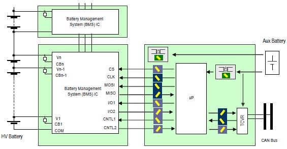 從上圖可以看出,電池高壓側(cè)的電池管理控制芯片需要配合上位機(jī)控制系統(tǒng)進(jìn)行數(shù)據(jù)傳輸和控制。 高壓側(cè)的電池管理控制芯片和上位機(jī)系統(tǒng)一般是兩個獨立的電氣控制系統(tǒng)。 它們之間的數(shù)據(jù)輸出和控制需要電氣隔離,包括各種高速數(shù)據(jù)的傳輸和其他開關(guān)信號的傳輸。 同時,電池管理系統(tǒng)BMS的信息狀態(tài)需要與車輛主控制器、電機(jī)控制器、能量控制系統(tǒng)、車輛顯示系統(tǒng)等進(jìn)行實時通信。 在電動汽車應(yīng)用領(lǐng)域,系統(tǒng)之間的信息共享和控制往往是通過CAN總線來實現(xiàn)的,從而使汽車時刻處于安全、穩(wěn)定、可靠的狀態(tài)。